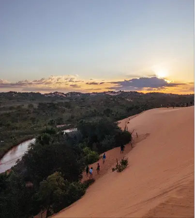 As Dunas, cartão postal do Jalapão, são compostas por areias finas e alaranjadas que chegam a 40 metros de altura. A serra do Espirito Santo é vista durante grande parte do percurso dentro do parque estadual do jalapão e tem uma trilha linda de 8 km. O melhor momento para fazer esta trilha é antes do sol nascer.