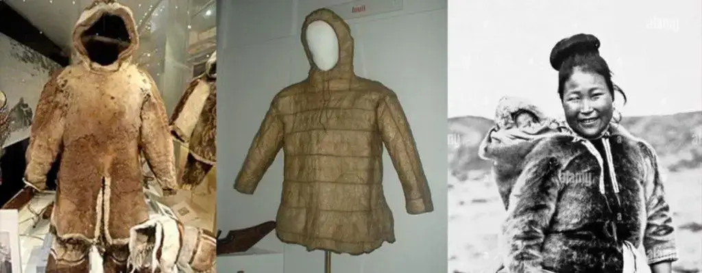 O primeiro anorak era feito de pele de caribu e tratado com óleo de peixe para garantir impermeabilidade. Essa peça era fundamental para caçadas e navegações em caiaques, oferecendo proteção contra frio extremo e umidade.