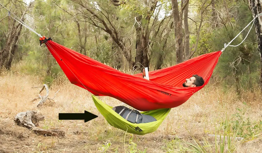 Use cordeletes ou fitas em conjunto com um mosquetão para isso. Se o tempo estiver com cara de chuva, ou se você quiser, vista a capa de chuva na mochila. Outra opção é deixar a sua mochila em um Gear Sling(uma rede menor), situada abaixo da sua rede. Essa rede de equipamentos pode ser improvisada ou comprada, como o da Sea To Summit abaixo: